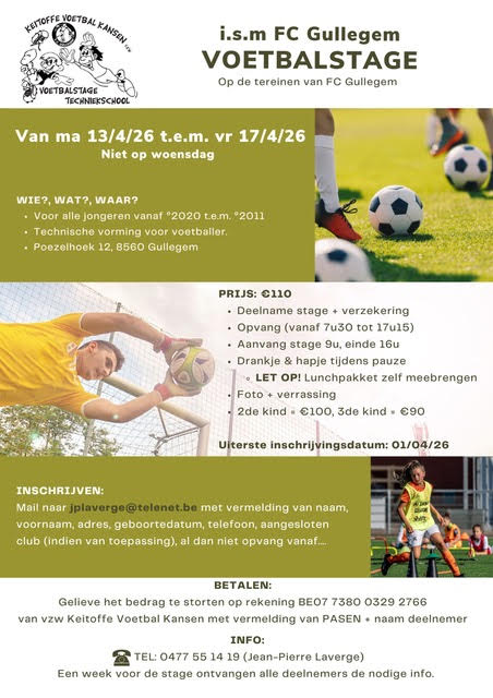 Tijdens de paasvakantie organiseert de Keitoffe Voetbal Kansen vzw, in samenwerking met FC Gullegem, een voetbalstage op de terreinen van FC Gullegem.